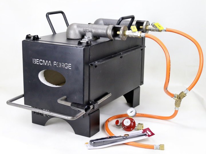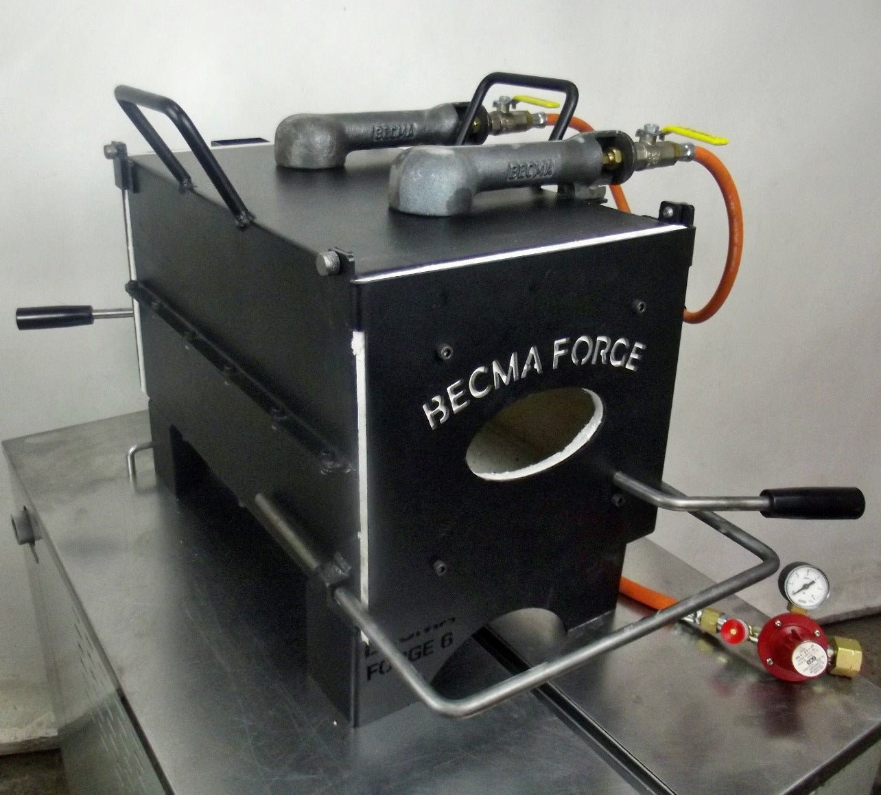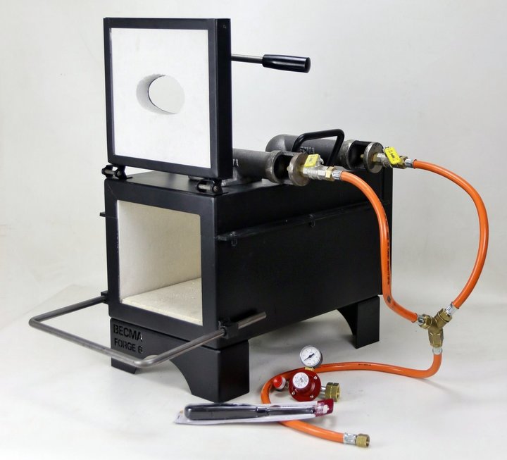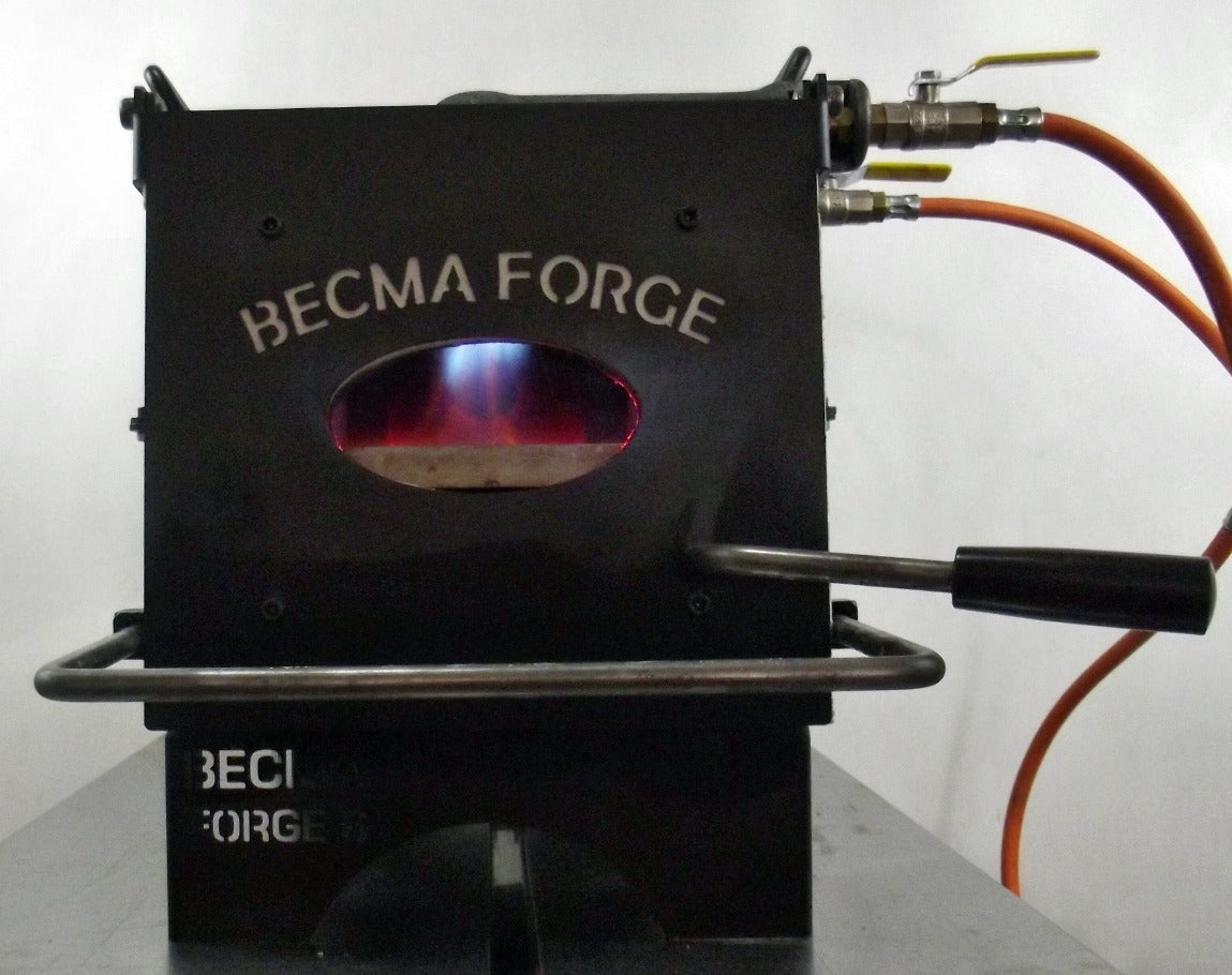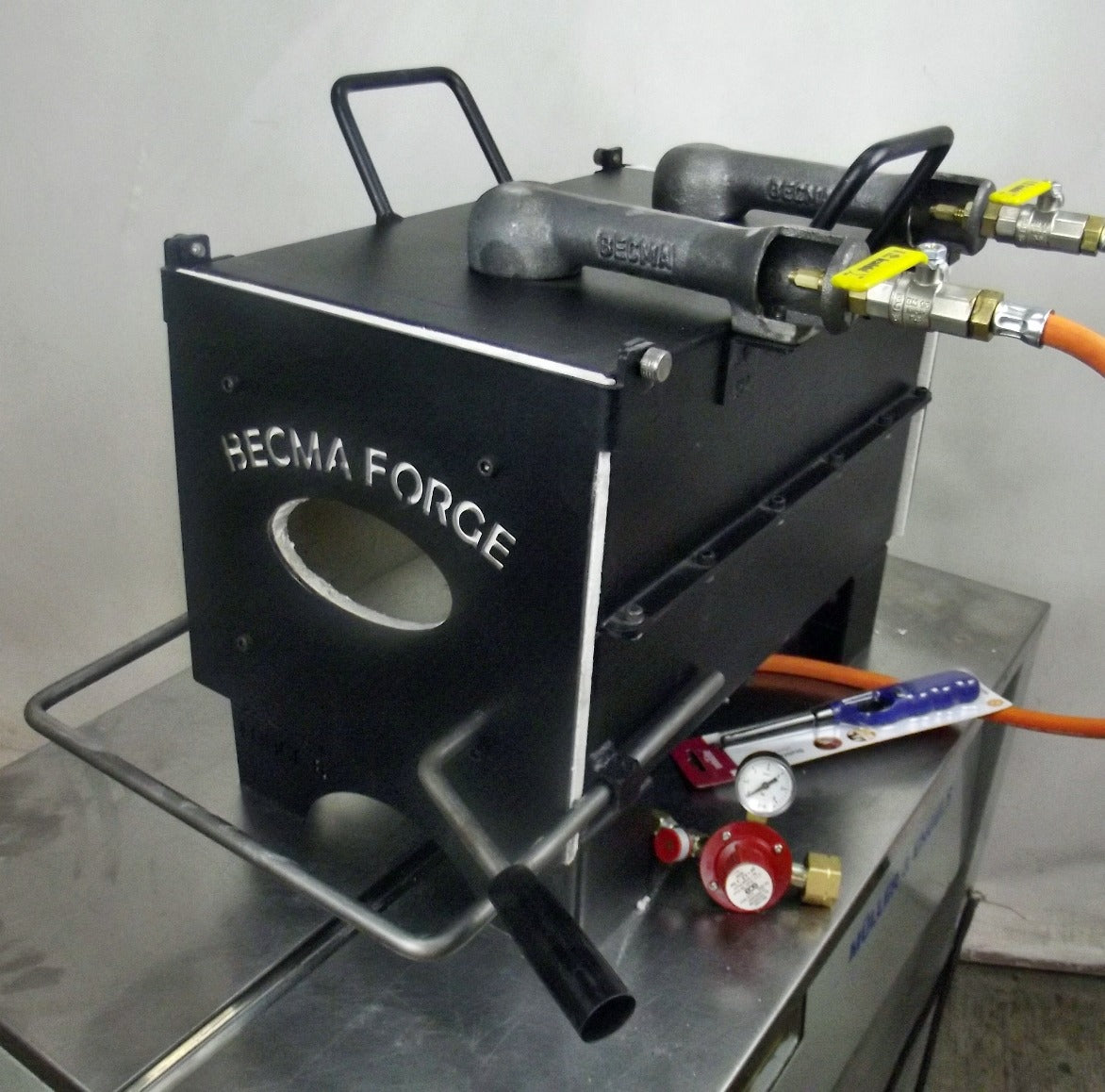 This complete system, including the casing, dual burners, and hose package, is a 100% BECMA FORGE design. With 40 mm ceramic fiber insulation lining the interior and dual-sided doors, the forge maximizes heat retention and provides convenient access to the internal workspace.