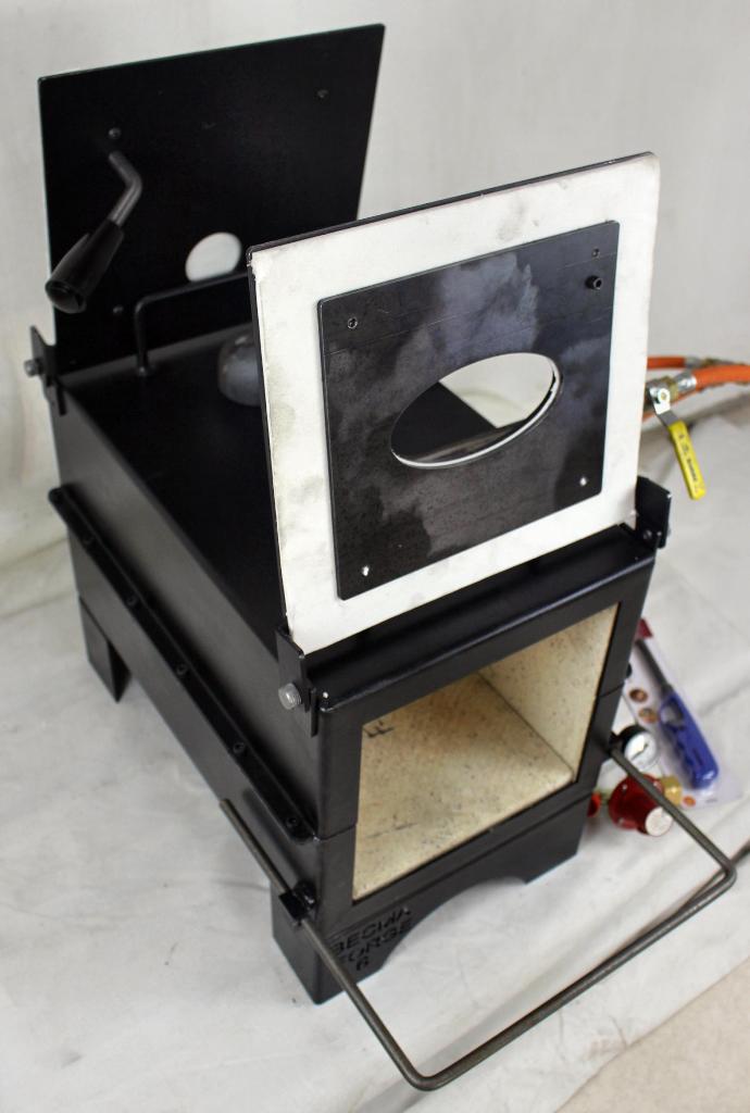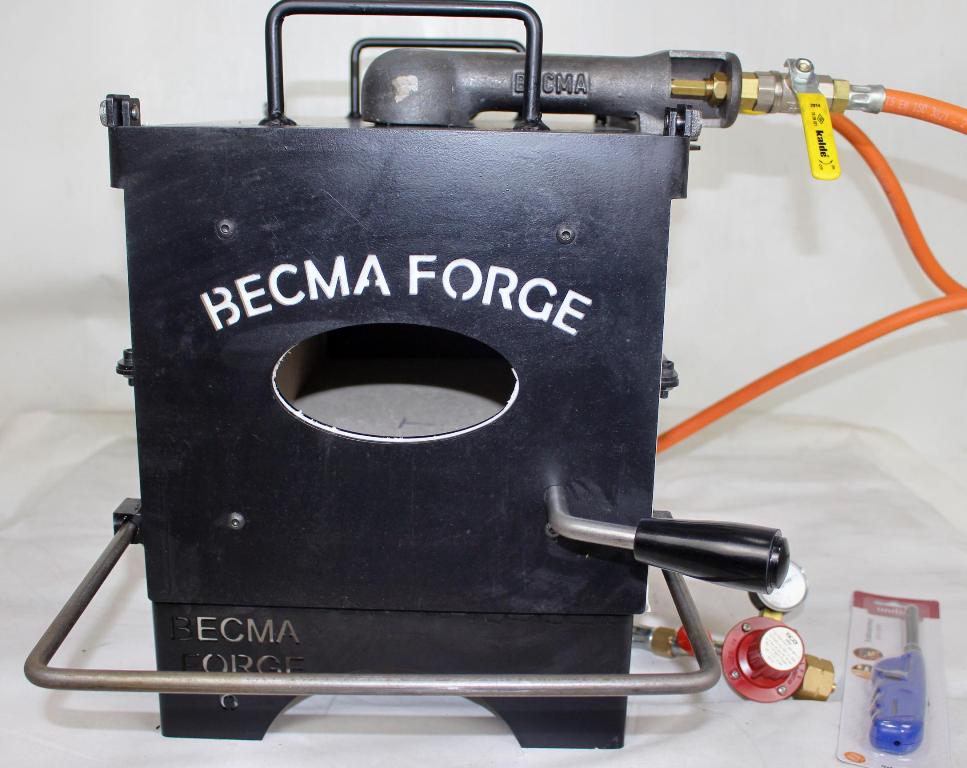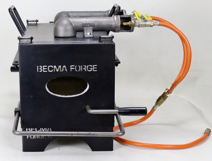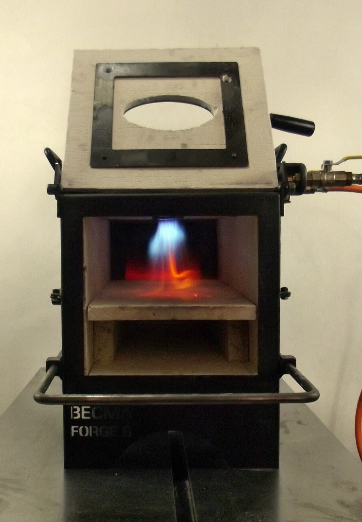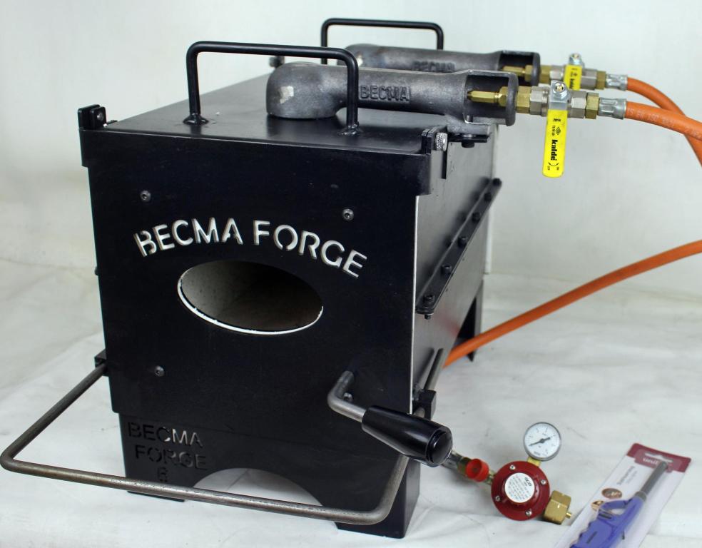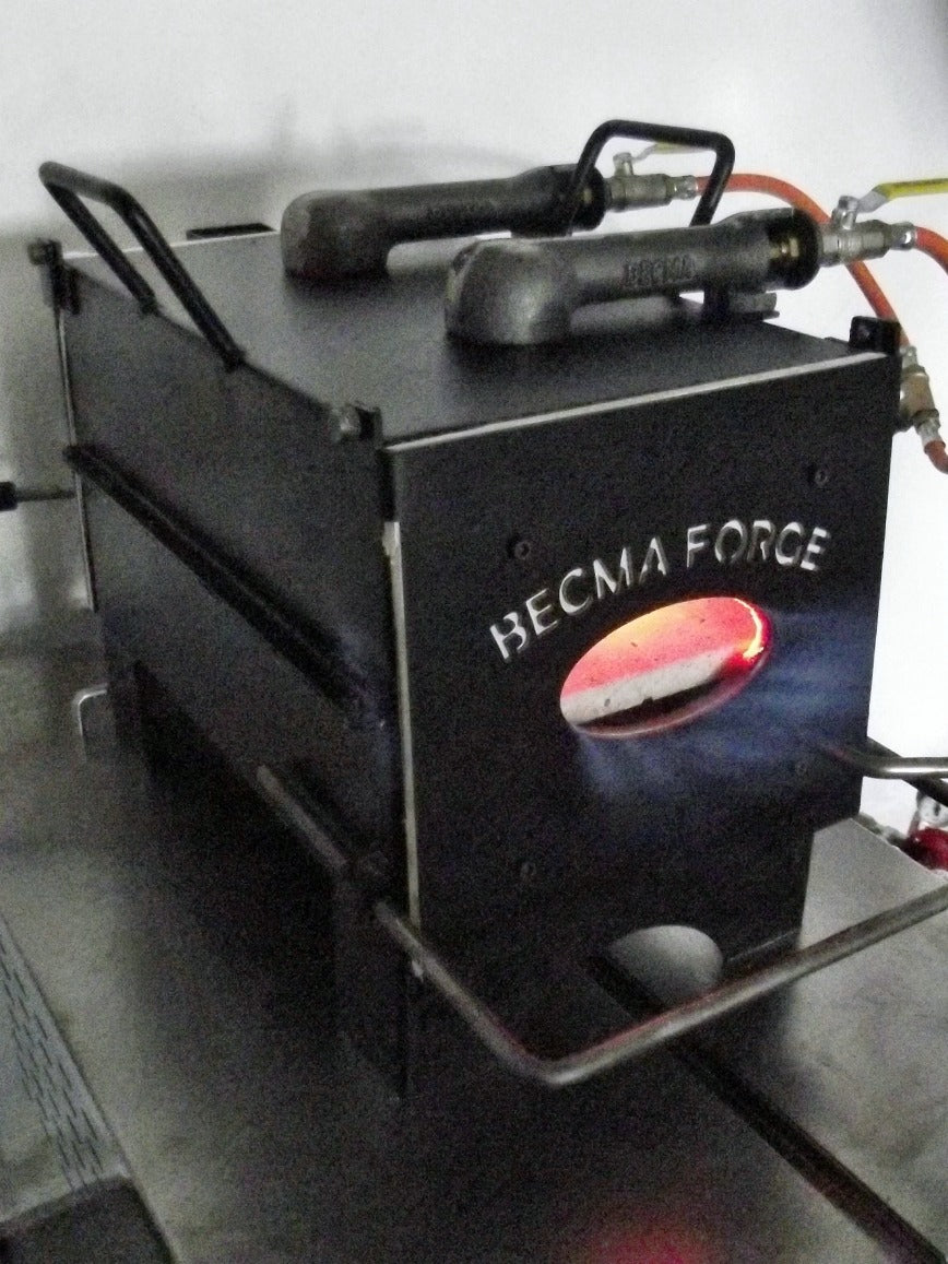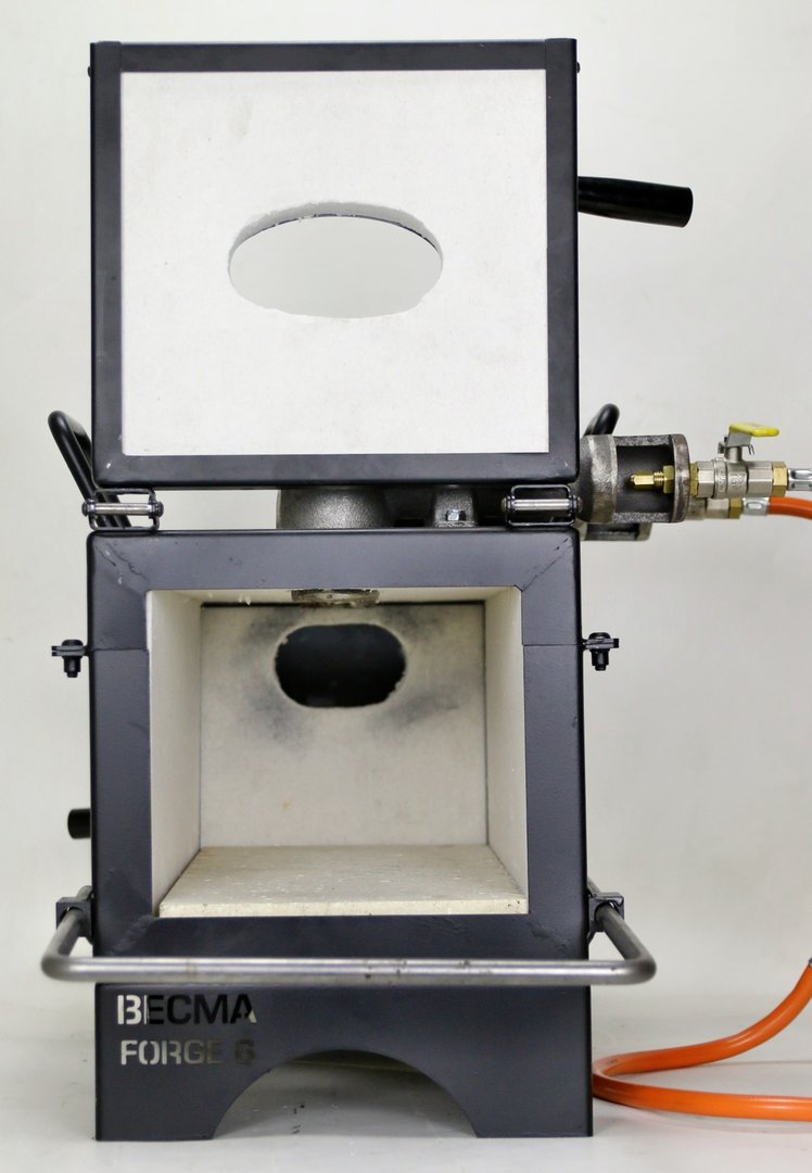 This complete system, including the casing, dual burners, and hose package, is a 100% BECMA FORGE design. With 40 mm ceramic fiber insulation lining the interior and dual-sided doors, the forge maximizes heat retention and provides convenient access to the internal workspace.